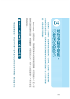 書中含括多種故事型態,包含親身經歷、他山之石、神話、典故、寓言與歷史故事等,甚至還精心設計了深具喻意的故事圖卡,幫助活化右腦思維,激發鼓舞人心的正向思考。不論是什麼身分、扮演什麼角色,我們都能乘著故事的翅膀,飛向美好的彼岸,成為一名有力的說服者、溝通者。