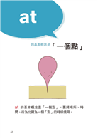 以往我們學文法、片語,只會「at+時間點/地點/年紀…」這樣卯起來逐條背,卻不明白為什麼要這樣用,結果就完全推給「這是老外的習慣用法,先記下來」的說法敷衍了事。其實一開始就不需那麼累,只要從一個概念出發,搭配圖解,相關的用法都從這個概念去聯想、延伸,自然不用背。例如,只要先懂 at 是「一個點」的概念,於是 at 後面所接的事物全都要被看作是「一個點」: