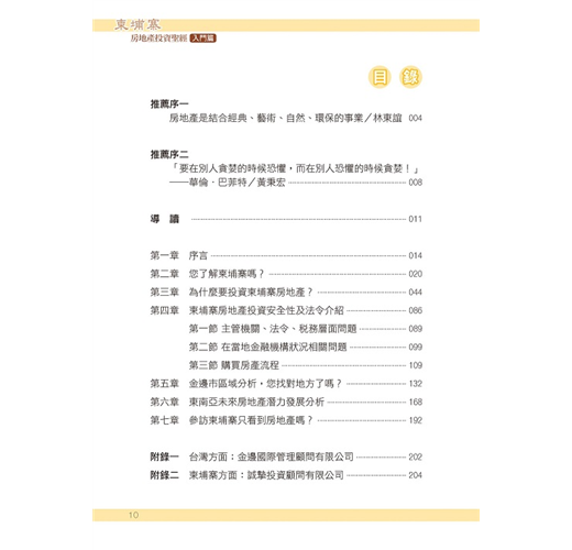 房地產是一個結合經典、藝術、自然、環保的經濟事業,本書不但能當作投資者跨入柬埔寨房產市場的工具書,同時,也能提醒投資者,在追求高報酬時,莫忘海外市場潛在的問題,並告訴你如何避開風險,安全穩定的獲利。