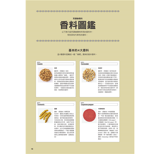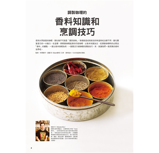 不同國家、不同家庭,甚至是不同店家的味道和吃法都不同,變化豐富是它的一大魅力。在這裡,將著重咖哩起源的印度咖哩,以基本知識為主,從調製咖哩時的必需品「香料」的觀點,一面以基本咖哩為例,一面廣泛介紹咖哩的調製技巧。來,就讓我們一窺深奧的香料世界吧!