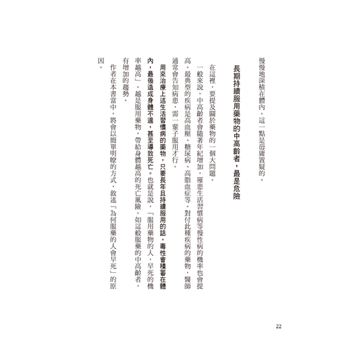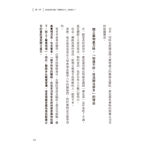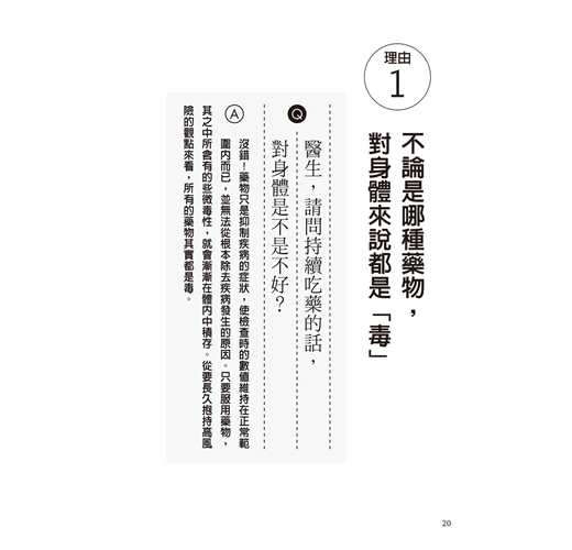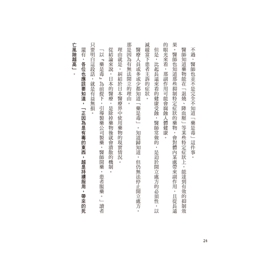 醫師會對患者使用各種話語,以勸說用藥。可是,不論醫師對你說什麼,你都一定要謹慎才行。除非是怎樣都忍受不了的痛苦症狀,或是逼近生死關卡的病況之外,為了你自己好,不要因為『慎重起見』、『暫且』之類的理由,就吃下含有副作用的藥物。假設要開始投藥,也務必要先設定好停藥條件和時期(目標)。有副作用的藥還硬是要吃,實在是不自然的事情,因此先設定好何時和該如何停止用藥,才是自然的想法,不是嗎?