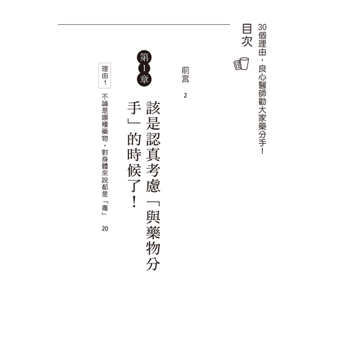 只要照著「30個理由,良心醫師勸大家藥分手」做,就不會掉入常時服藥的陷阱裡,也能將藥物對身體造成的危害壓到最低限度。從三百多年前起就是老生常談了,現在幾乎被大家所忽視,但是這才是所謂的通往健康長壽的捷徑。