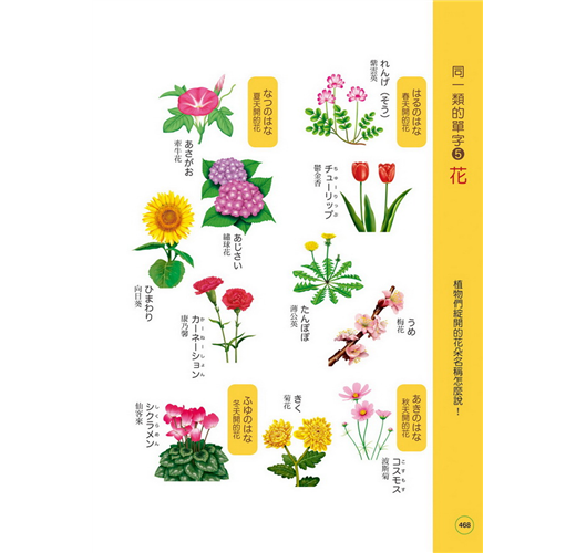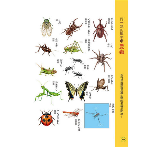 書末有擷錄部分同主題下單字(例如:動物、鳥類、昆蟲、植物、時間、日本地圖…等)的補充頁,並配上插圖,讓孩子能夠一次記住同主題的單字。