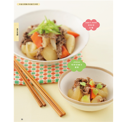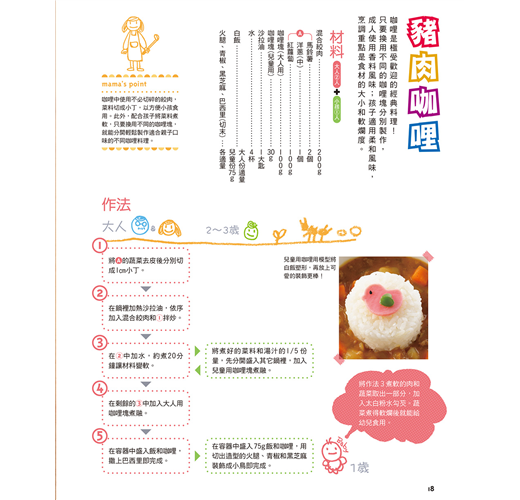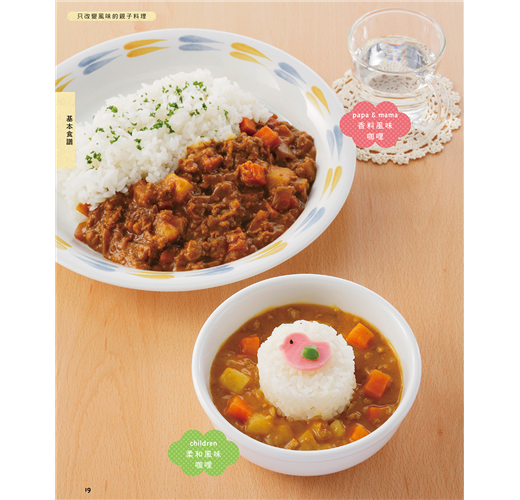 這本書教大家,在做大人餐點的時候,可以先取出一部分,做成適合小朋友口味的料理,鍋子中的則調味成大人的口味。比如製作豬肉咖哩時,將煮好的材料取出一部分,用來調味的咖哩,小朋友的部分,只需加入約大人的1/3量,將調味調淡;還有做成小朋友容易拿取或咀嚼的大小,比如可樂餅,大人的做成圓餅狀,小朋友的做成小圓球狀,這些巧思,讓父母不用花費太多時間,就能同步完成全家人的一餐,小朋友也可以和大人一起吃一樣的餐點,享受同桌的樂趣。