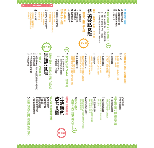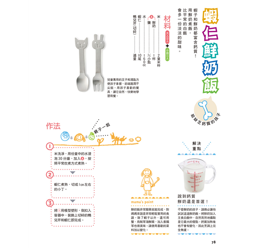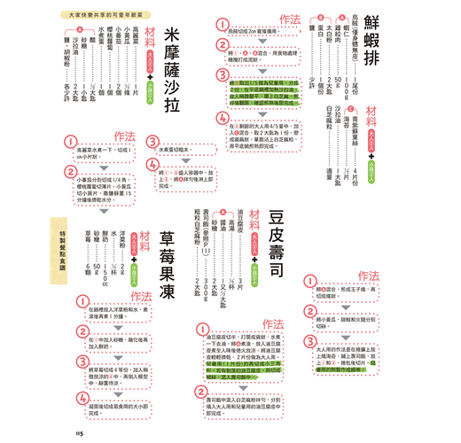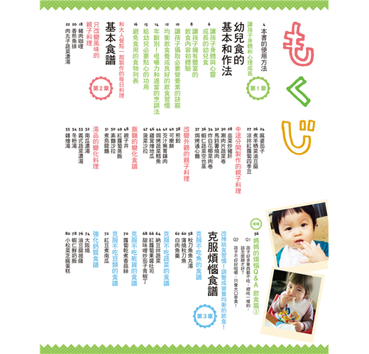 此外,還有幫媽媽解決小朋友飲食問題的各種食譜,比如小朋友不愛吃魚或蔬菜時,這本書也有克服問題的方法及好吃的食譜,相信能逐漸改善小朋友挑食的問題。