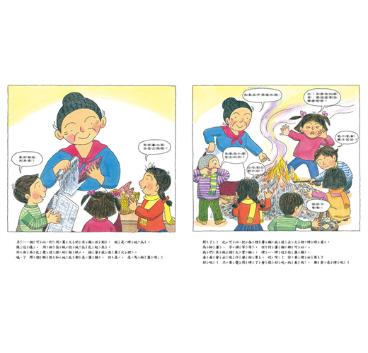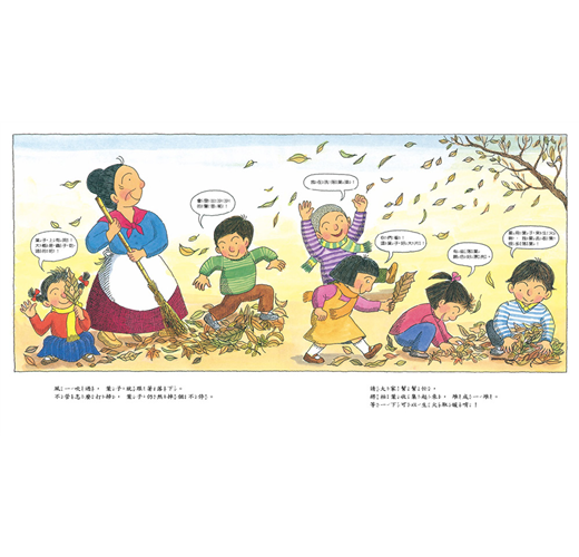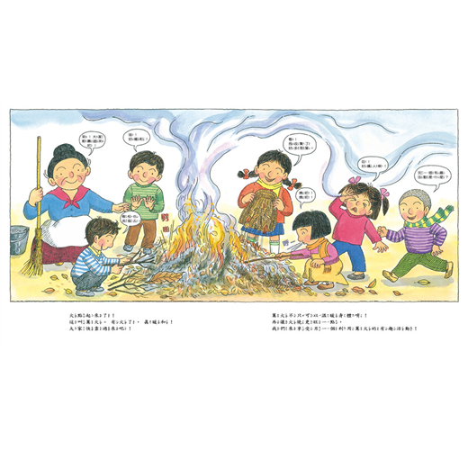 本書原文為日文。在日本,有庭院的人家中因為秋冬落葉甚多,故會將其聚集點火燃燒,藉此不僅能做土壤的養分,同時還可以燒烤用鋁箔紙包裹好的食物,最常見的便是烤地瓜了。在台灣,雖然已很少見人用如此傳統的方式烤地瓜,畢竟除非有廣大的農地,否則的確難以實行。但在假期時節,若父母能帶著孩子一同去農家散步走動,有些地方也能體會到傳統的烤地瓜樂趣呢!