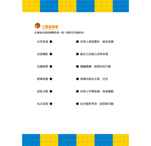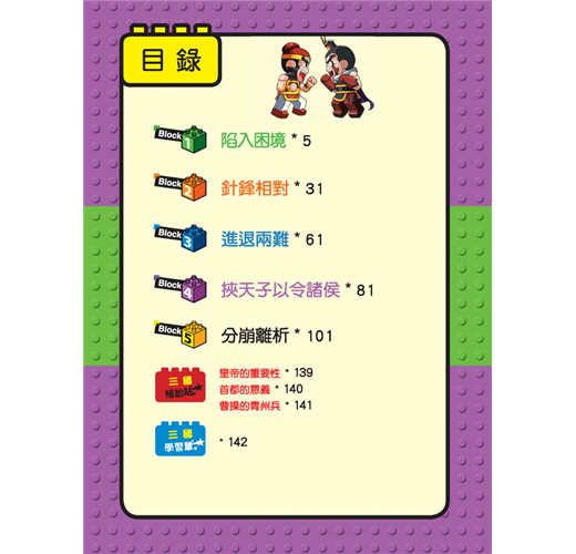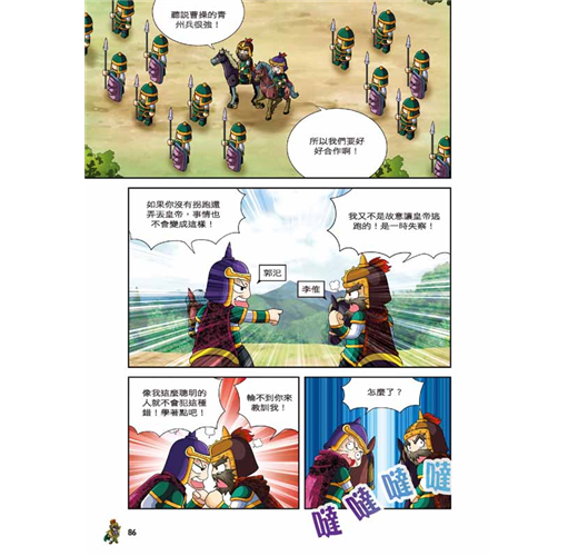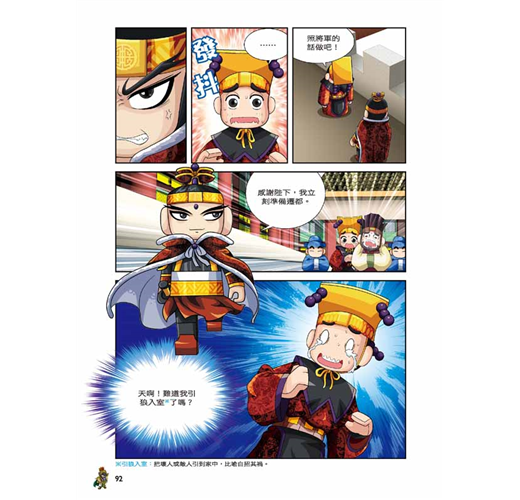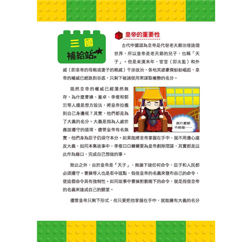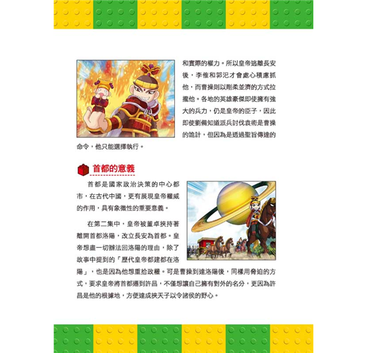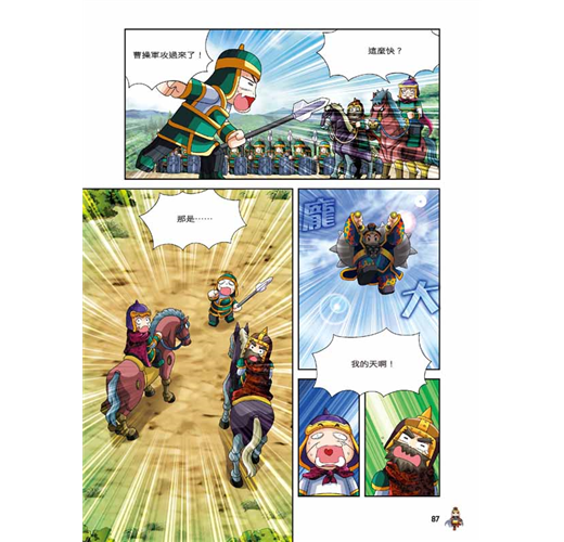 ‧ 不一樣的知識含量:隨頁補充對話中的經典成語或名言,並且設置「三國補給站」小單元,詳細介紹三國人物及時代背景,讓小朋友的語文能力和歷史常識都UP!UP!