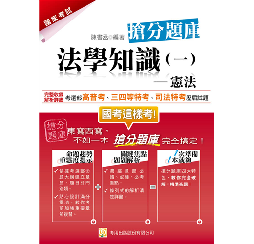 不用通勤跑補習班浪費時間,考用名師幫你把重要考題按照章節及重要度有系統的整理好了!搶分題庫共分十六章,各章均先介紹重要且必考的觀念,解題輔以大法官釋字及憲法之概念,協助考生在「憲法」獲取高分。考生更能搭配考用出版的《圖解制霸 法學知識(一)憲法》融會貫通,相信對應戰實力,絕對有相輔相成的助益。
