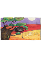 他把梯子靠在大橡樹上,把籃子夾在胳膊下,慢慢往上爬。