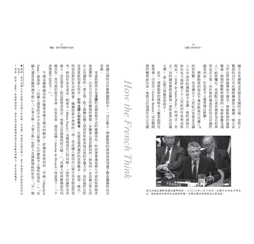 而無論在智識上、軍事或政治社會的歷程上,此六角形狀的國度和其他國家間曾經且持續地相互影響。前法屬殖民地之爭取獨立,矛盾卻也合理地與自由、平等和博愛此等現代法國號稱尊崇至上的普世精神有直接關係。讀者們透過本書鉅細靡遺且旁徵博引的說明,得以一窺作者對近現代法國智識活動的歸納和分析,也別忘了法國或法國人長久以來都不是一個單一靜止的概念,也絕不是隔絕於歐洲、甚至國際大環境的各種事件與時代精神之外,而是由有血有肉之多元個體,在各種因素之下交相糅雜,融合變異,樣貌持續改變的有機體。