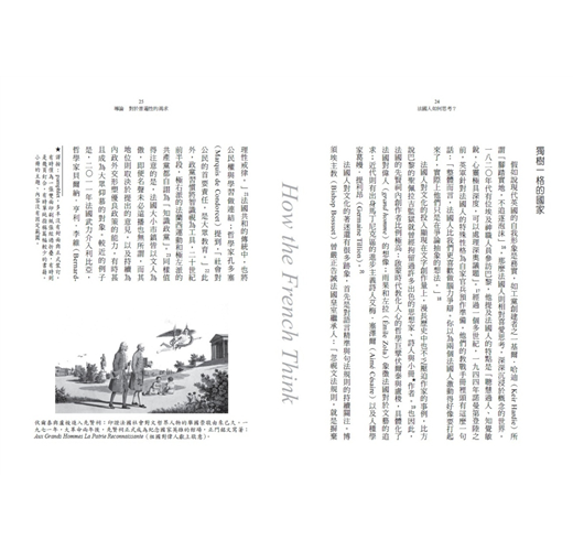 如果法文寫作課堂發下了「法國人如何思考」這樣一個題目,該如何下筆?受過法文寫作訓練的人必定會由界定題目的主旨開始。這裡的法國人指的是什麼人?思考在此指的又屬於何種範疇?從法文論述的角度來看,這些可都不是單靠自由心證或不證自明這種藉口可以含糊帶過的事情。與定義思考比起來,定義法國人不見得比較簡單。它指的是一個民族、一個國籍、一片特定疆域上的住民,還是一種文化傳統?形容詞 French 指的又是法國、法式、法文的或是法國人的?顯然不乏討論...