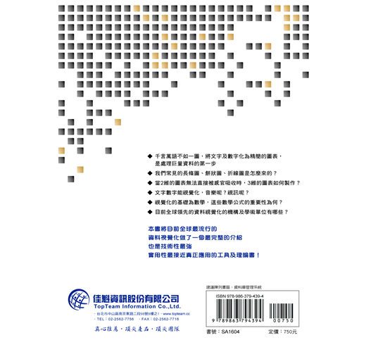 本書從研究者的角度,介紹了資料視覺化的定義、方法、功效和實用軟體,將目前全球最流行的資料視覺化做了一個最完整的介紹,也是技術性最強,實用性最接近真正應用的工具及理論書!