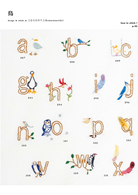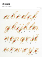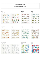 有21種英文字母的設計,其中4種是小寫,主體有「玫瑰」、「動物」、「鳥」、「蝴蝶」、「蔬菜」、「水果」、「旗幟」等,能夠在專屬於自己或家人的物品上繡上英文名字或縮寫,比如包包、手帕、束口袋、杯墊、圍巾等,附上實際大小的設計圖,也清楚標示繡線顏色,並解說各種繡法,每個人都能創造出獨一無二的個性物品。