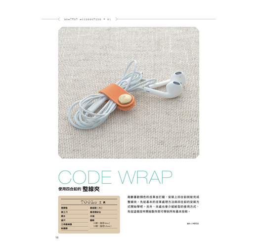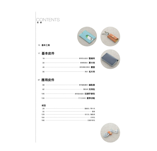 本書以詳細的步驟圖羅列整線夾、票卡夾、書套、名片夾、鑰匙套、托特包、拉鏈手拿包、拖鞋⋯⋯8種日日都會用到的隨身零件製作技巧,