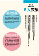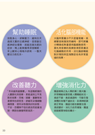 (1)提升代謝(2)促進血液循環(3)活化腦部機能(4)增強消化力(5)幫助睡眠(6)改善聽力。