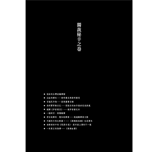 最末的「娛韻繞樑之卷」分享作者在辦案過程中發現的一些有趣現象,以博讀者一粲,如台日對照、做為學習台語之用、台灣最早的《伊索寓言》(1901),台灣最早的莎士比亞故事〈丹麥太子〉(即〈哈姆雷特〉,1906),最早的安徒生童話中譯其實是台灣出版的〈某候好衣〉(即〈國王的新衣〉,1906),把名盜亞森羅蘋的犯案現場移到高雄的《黃金假面》(1960),《拾穗》出版的香艷大膽蕾絲邊譯作《女營韻事》(1963),譯者邊譯邊貶作者的《紫金城的黃昏》(1965),《畢業生》的七本中譯因「違反善良風俗」而遭禁(1971),使徒保羅由希臘文、經英文轉譯為中文聖經和合本、再譜為曲的〈愛的真諦〉(1973),把作者誤認為柯南道爾或其好友華生的《最後的難題》(1975),以及荷蘭漢學家高羅佩(Robert Hans van Gulik)由譯者成為作者而撰寫的充滿東方(主義)遐思的神探狄仁傑(1982)。