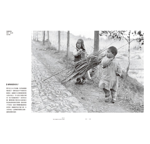 還有一幅照片描寫的是在妙峰山行乞的老婦。史景遷教授寫道:「●從她那宛如水手海圖一樣充滿皺紋的臉上,你可以讀到整個中國歷史。」●《粥廠嬉笑的男孩》展現的是北京冬天慈善機構設立粥棚,為無家可歸的窮人施粥的景象。兩個身穿破棉衣的男孩,在一所小學臨時開設的粥棚排隊等待一碗熱粥。男孩的笑容發自內心,友好、自然、機靈、開心,沒有半點困苦的表情。如果有上學的機會,他們也會像背後牆上成績單裡的學生一樣,名列前茅。
