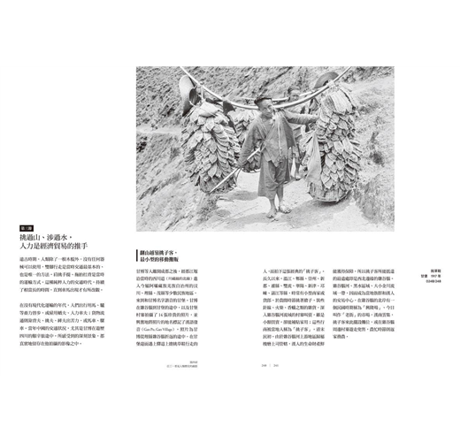 在缺乏現代化運輸方式的年代,客運和貨運要靠成千上萬的人力車夫、獨輪車夫和轎夫等苦力的雙腳和雙肩。甘博在四川山區的攝影之旅就曾雇用15名苦力載運其一行三人和17件行李。其他像是人力運送木材、茶葉、煙草、鹽、草鞋、糧食、水等貨物的生動照片,在甘博的收藏中也比比皆是。