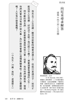 ‧尼采否定基督教,宣稱「上帝已死」。基督教認為人的脆弱是正確的,只要將一切託付給神,為神奉獻,人的脆弱即可得到救贖,而這就是人生的價值。但尼采主張人可以靠自己的力量變堅強,接受人生的「永劫回歸」,接受不斷循環的苦難與黑暗,並且征服它,堅強而光明地活下去。如此一來,人便不必當神的奴隸,不必追求基督教的價值。