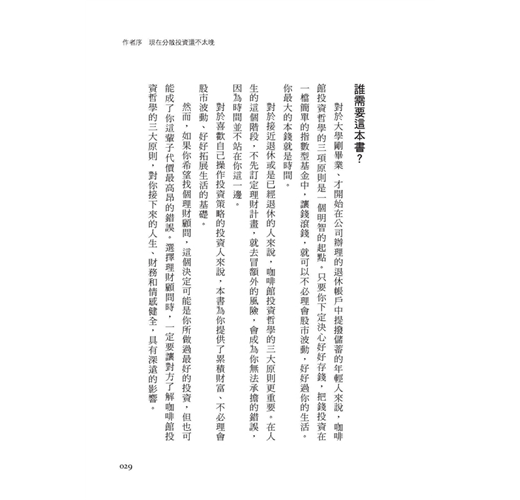 環顧這個世界,你會發現還有很多美好的事情等待人們去完成,居然有這麼多人把精力浪費在努力「打敗大盤」,真是一場悲劇。讓我們一起分享咖啡館投資哲學,對千萬投資大眾,產生深遠的影響吧。如果你跟其他投資人一樣,都希望累積財富、想好好過自己的人生,你可以讓自己變得不同,你現在所做的就是這麼一回事。
