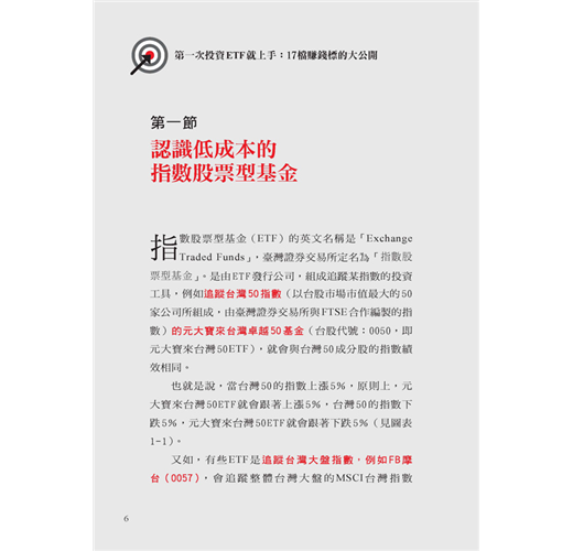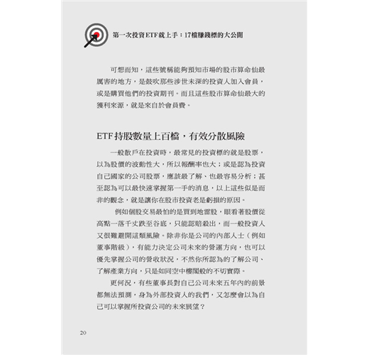 「除了臺股ETF外,本書也推薦了17檔其他國家的ETF供讀者參考,因此不論你的主要資產是臺幣或美元,都可以找到最適合自己的。如果能夠用簡單的方法就能賺到10%至20%的報酬,何必還要用既複雜又令人焦慮的方法呢?」