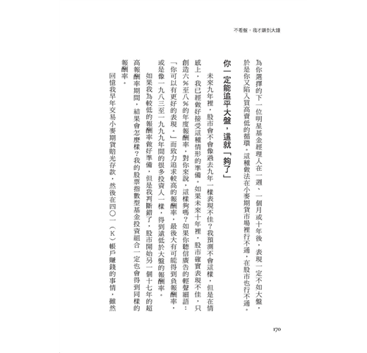 金融業用盡各種方式,吸引我們加入追求績效的遊戲,他們吹捧、兜售自家的五星級共同基金和最高評等的股票。投資公司裡的理財顧問太沉迷於「打敗大盤」,以至於很容易向追求績效屈服。最後,我們開始認為,致富的祕密就是建立成功的投資組合,投資股市,「打敗大盤」。