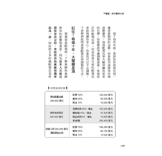 一、資產配置:在股票、債券和現金之間,選出最好的組合,才能盡量降低風險、提高達成理財目標的機會。