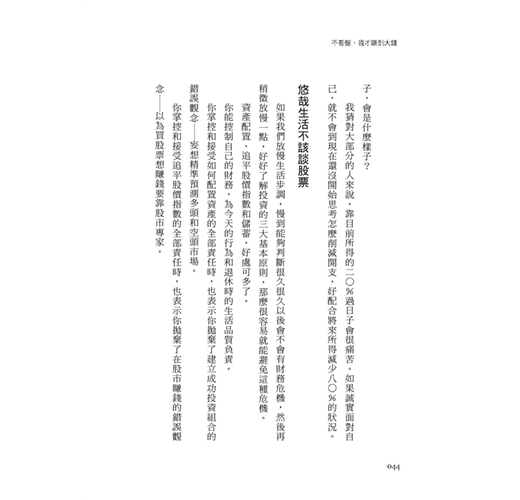 對於喜歡自己操作投資策略的投資人來說,本書為你提供了累積財富、不必理會股市波動、好好拓展生活的基礎。
