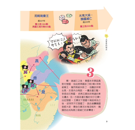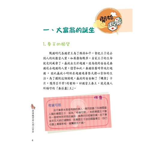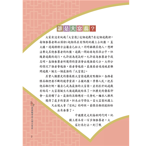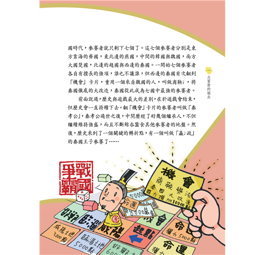 在競爭與合作的趣味中,處處是人性的紋理。三民書局「歷史遊戲王」建起一座遊樂場,透過孩子熟悉的遊戲模式,傳達中國各時代的精神與歷史意義,例如用疊疊樂的概念比擬上古時代文化和制度的奠基與崩壞,又如用大富翁遊戲讓孩子了解秦漢到隋唐之間的地盤爭勝……。