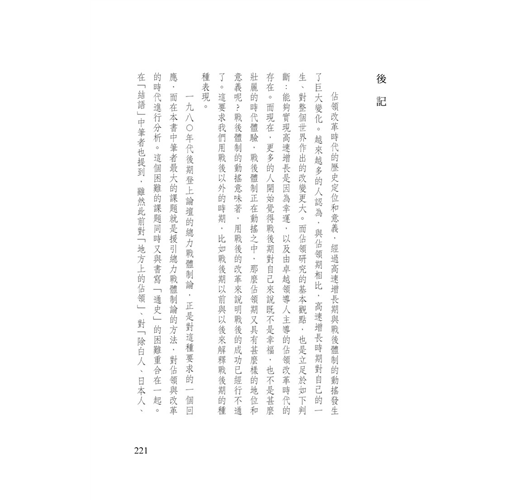 一九八○年代後期登上論壇的總力戰體制論,正是對這種要求的一個回應,而在本書中筆者最大的課題就是援引總力戰體制論的方法,對佔領與改革的時代進行分析。這個困難的課題同時又與書寫「通史」的困難重合在一起。在「結語」中筆者也提到,雖然此前對「地方上的佔領」、對「除白人、日本人、男性、健全者以外的主體的佔領」進行了調查研究,但那與把研究成果運用到「通史」的書寫中,還相差甚遠。