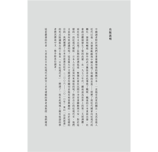 中國讀者對於與我們有著複雜情緣的鄰國日本,一直抱有高度的關注。尤其是進入近代以後,其發展軌跡與中國出現了明顯的差異—經歷了前近代國家向近現代的轉化、發展和崛起,對外的武力擴張並由此導致了戰敗。戰後的日本重新出發,社會政治體制發生了質的改變,在一九七○年代一躍而成為世界上的第二大經濟體,而在近年又出現了長期的經濟低迷,整個社會在沉悶中孕育著躁動與不安。對於這樣的一段近現代歷程,日本人自己是如何來描述的呢?對於自己的近現代史,他們又是如何來認識的呢?這是廣大中文圈讀者所關切並抱有相當興趣的。出於這樣的目的,我們選擇了日本岩波書店近年(二○○六—二○一○年)來以「岩波新書」的形式陸續推出的十卷本「日本近現代史」,聘請了一批在此領域上頗有造詣的學者將其譯成中文,推介給各位讀者。