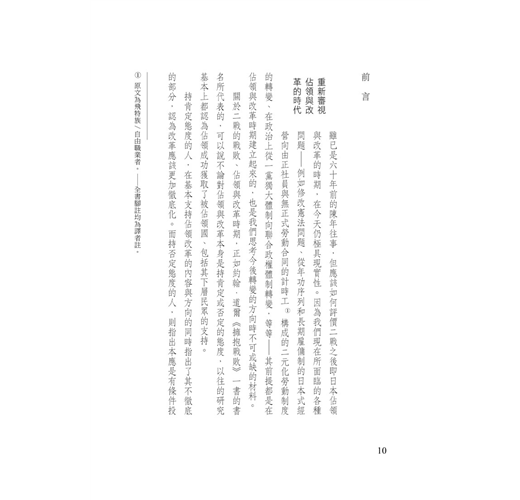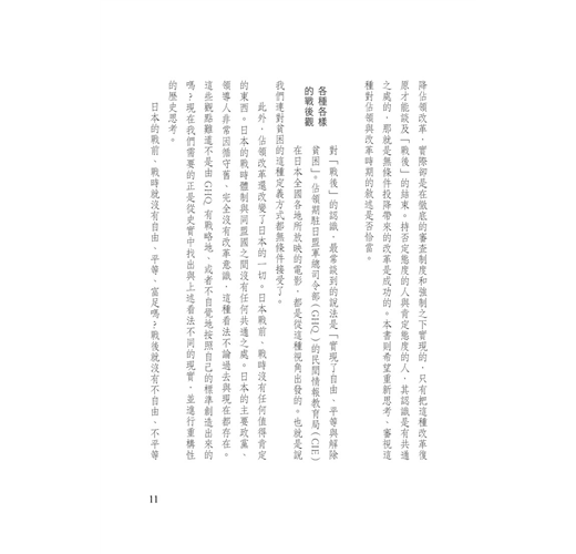 日本的戰前、戰時就沒有自由、平等、富足嗎?戰後就沒有不自由、不平等和貧困嗎?戰前、戰時不是有一種「協同自治」的觀點嗎?它既不同於市場全體主義又不同於國家主義。在帝國主義、總動員體制、管理社會等各方面,戰時的日本與同盟國之間不是存在著共同點嗎?以及,關於體制和憲法的構想,佔領期的日本政府和領導人就真的沒有自我變革的能力嗎?