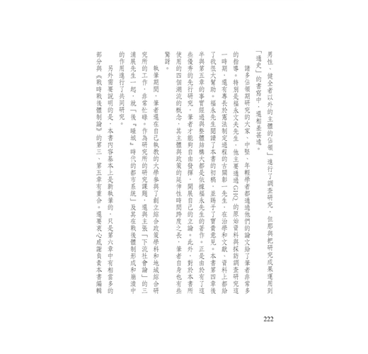 諸多佔領期研究的大家、中堅、年輕學者都通過他們的論文給了筆者非常多的指導。特別是福永文夫先生,他主要通過GHQ的原始資料與採訪調查研究這一時期,還有專長於憲法制定過程的古關彰一先生,在治學和文獻、資料上都給了我很大幫助。福永先生閱讀了本書的初稿,並賜予了寶貴意見。本書第四章後半與第五章的事實經過與整體結構大都是依據福永先生的著作。正是由於有了這些優秀的先行研究,筆者才能夠自由發揮,開展自己的立論。此外,對於本書所使用的四個潮流的概念,其主體與政策的延伸性時間跨度之長,筆者自身也有些驚訝。