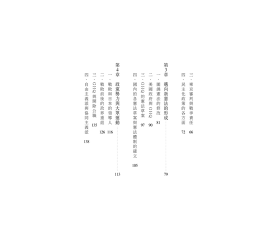 第一章討論佔領改革在政治上、社會上的前提條件:政治上四個政治潮流中的反東條聯合取得了勝利,社會上總力戰體制帶來了社會變化,這些都是戰後的出發點。