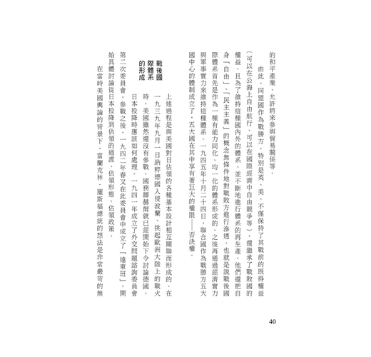 但戰後國際體系層面上最強有力的力量一直是戰勝國體系。忽視了這一點,那對戰後的看法必然是局部的、恣意的。為了更加通俗易懂地敘述戰後,必須要有體系性、整體性的觀點。也就是說,要將戰後放在國際關係、政治、經濟、法律、社會、地區等包含了這個體制所有領域的系統及其相互作用中去看待,去敘述。只有這樣才能構成基於學術的新的表達。