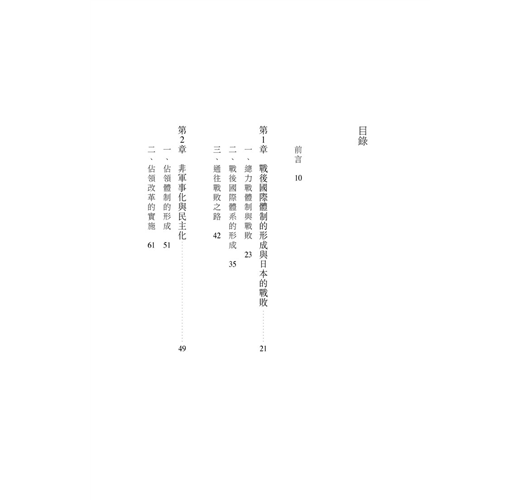 本書對戰後十年的敘述,將通過各章對戰敗與佔領分別帶來的改革的區別 ──沒有佔領也會進行的改革、佔領所帶來的改革、既沒有佔領又沒有戰敗的前提下也會進行的改革 ── 進行思考來實現。