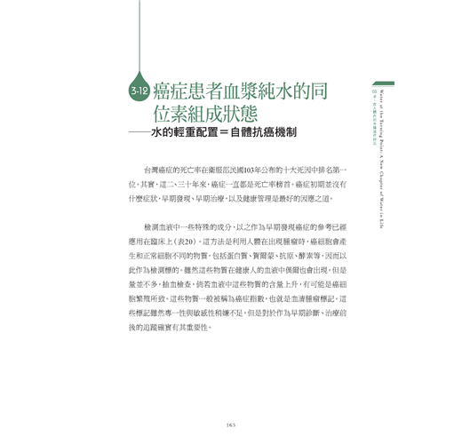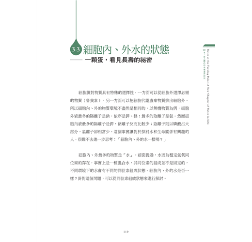 作者多年的研究發現,一般水和體內水有不同的穩定同位素組成狀態。細胞內生化分子不僅需要水來驅動,使其摺疊形成具生理活性所必需的立體構造,更需要從水獲得同位素以安定細胞內生化分子,藉此抵禦氧化或輻射攻擊。這個發現使我們終於明白,為什麼生命離不開水。