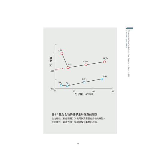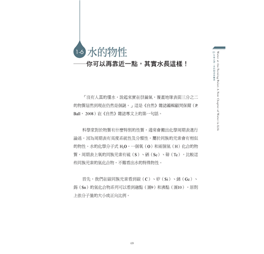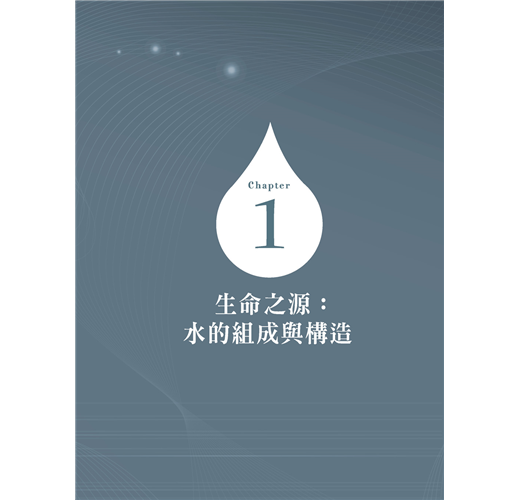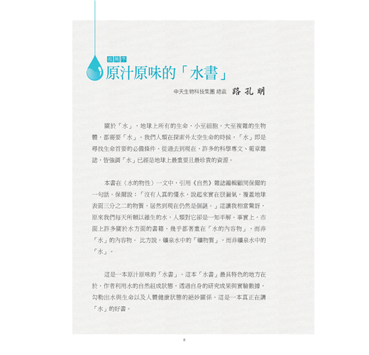 本書在〈水的物性〉一文中,引用《自然》雜誌編輯顧問保爾的一句話。保爾說:「沒有人真的懂水,說起來實在很漏氣,覆蓋地球表面三分之二的物質,居然到現在仍然是個謎。」這讓我相當驚訝,原來我們每天所賴以維生的水,人類對它卻是一知半解。事實上,市面上許多關於水方面的書籍,幾乎都著重在「水的內容物」,而非「水」的內容物。 比方說,礦泉水中的「礦物質」,而非礦泉水中的「水」。