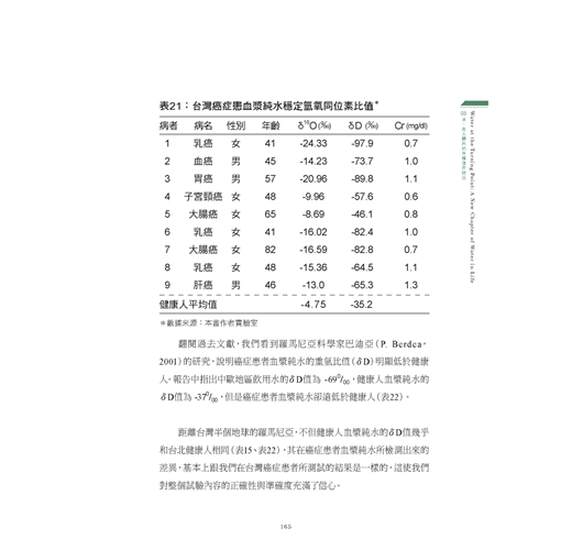 健康檢查的目的是要了解自己身體的健康狀態,檢查的項目依各醫院或健檢中心多少會有些不同,而血液檢驗則屬於必要的檢查項目。目前的血液檢驗,幾乎是「溶質」的檢驗,對於不可或缺的「溶劑」卻往往漠視。根據作者的研究,血液中純水的「穩定氫氧同位素組成狀態」是用以評估全身性健康狀態的最佳的指標。這是人類醫療史上不可輕視的一項重要研究報告。