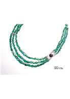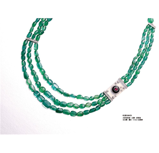 還有一種繁複,譬如在月光石的系列裡,有一串層疊交纏,細細密密串起的項鍊,晶瑩的顆粒間,又加上了許多不同材質不同造型的寶石,好像設計者希望把人間所有的幸福觸動都盡可能地聚集在一起,把所有美好的剎那都織成珍寶,彼此相會於頸間於胸前,於一個端麗的女子的心懷之上……