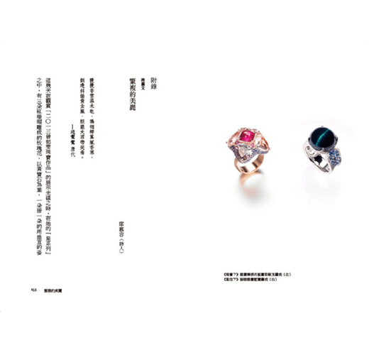 曾郁雯珠寶作品的令人讚嘆之處,就在於它們繁複的美麗。往往在我們以為已經完成並且接近完美的造型裡,她卻可以再來加添一種顏色,或者,再去營造出一番曲折。這種加添有時是不容易察覺的柔婉,有時可真是十分強烈呢。
