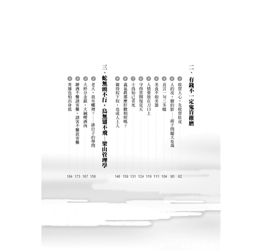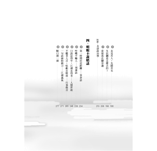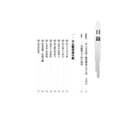 《水滸傳》是中國四大奇書之一,沒看過原著的人也必定對其中的一些人物或事件朗朗上口,比如:梁山泊共有一○八條好漢、武松打虎、林沖夜奔、七星聚義、花和尚魯治深、及時雨宋江、梁山泊的超級幕僚吳用、神行太保戴宗、黑旋風李逵、母夜叉孫二娘、奸佞小人高俅和梁中書、……,每個人物都形象鮮明,他們彼此間的互動與關係中也隱藏著不少學問,彷彿現代社會的縮影。