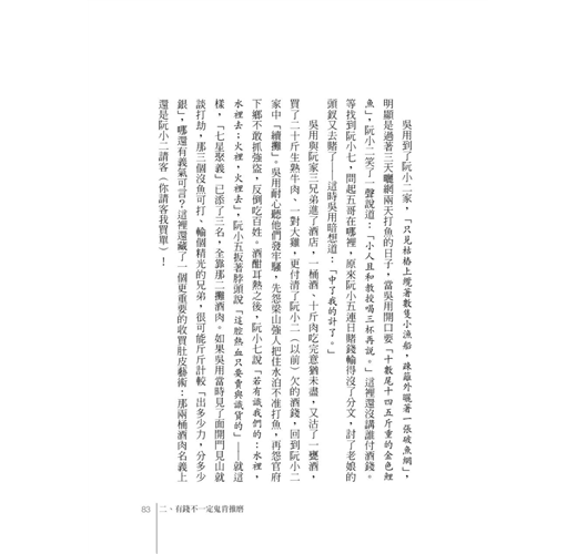 試想,施恩被蔣門神打得「兩個月起不得床」,而武松卻可以三拳兩腳「打得蔣門神在地下叫饒」,如此懸殊的本事,如果施恩在武松初報到時就提出要求,武松會理他嗎?即使因為「不怕官,只怕管」為施恩出氣,也斷無可能與他結拜──就是那幾頓「不求回報,先喫再說」的酒食,收買了武松的肚皮,才換了武松的情義相挺。義氣需要物質的灌溉,重點更在肚皮。