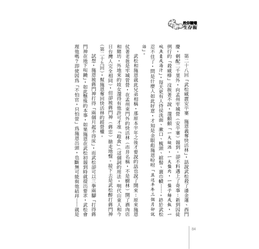 用《水滸傳》做舉例母本,一個原因是很多人看過這本小說,沒看過整本的朋友也對「武松打虎」、「林沖逼上梁山」等故事耳熟能詳,不致生疏費解;另一個原因是,梁山一○八好漢都是「光棍階級」,少數資產階級或官僚出身的在上了梁山之後也成了光棍階級,也就是無依無靠、沒有社會資源、赤手空拳闖蕩天下,他們全靠這一套江湖生存術縱橫天下——本書的讀者基本上都比這些英雄好漢擁有更強的專業技能、更多的社會資源與更密的人脈,如果能善自揣摩並適當運用這一套江湖生存術,想必更能夠在全球化浪潮中無往不利。