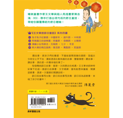 每個傳統節日故事,都是一次與歷史的相遇。王文華老師神奇彩筆下的這一套節日故事書,文字精鍊,富有創意與童趣,閱讀這套書,真是一次富饒的閱讀旅程。