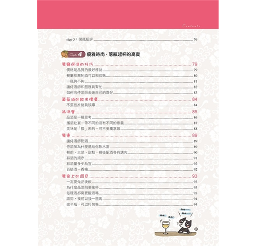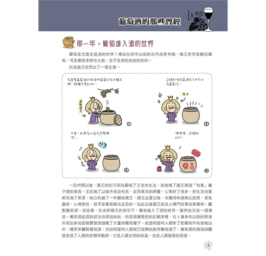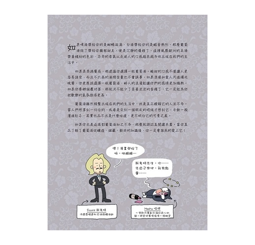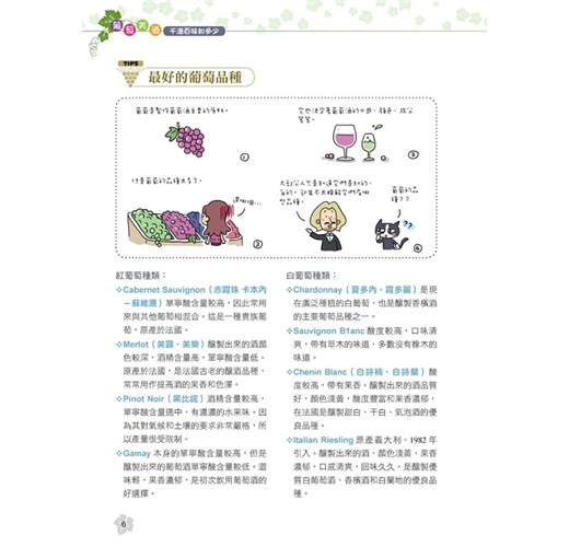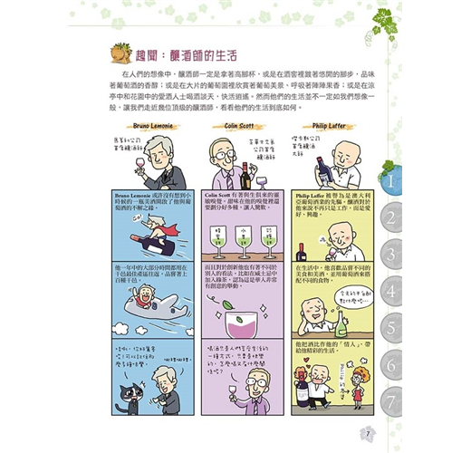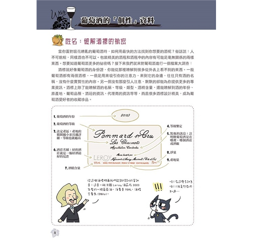 更值得一提的是,為了便於讀者閱讀和記憶,本書加入了風趣幽默的三個人物角色和一隻可愛的貓咪,圖文並茂地、輕鬆地、情景化地圖解葡萄酒知識,使本書成為最親民、最實用、最有趣的葡萄酒說明書。
