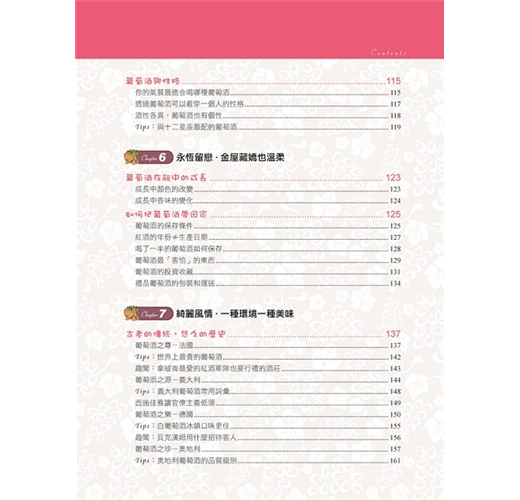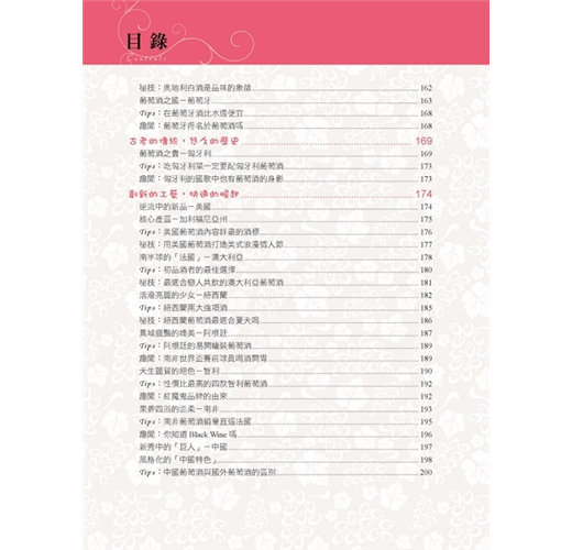 本書從葡萄的採摘、發酵、釀制、營養,到葡萄酒的酒杯、酒瓶、價位、收藏,再到養生、佐餐、品飲,360度涵蓋葡萄酒知識,具備全麵而實用的指導性。除了這些基礎知識外,還分類講述了法國、義大利、德國、奧地利、葡萄牙、美國、澳大利亞、紐西蘭、阿根廷、南非、中國等國的葡萄酒等級、品味與特色。