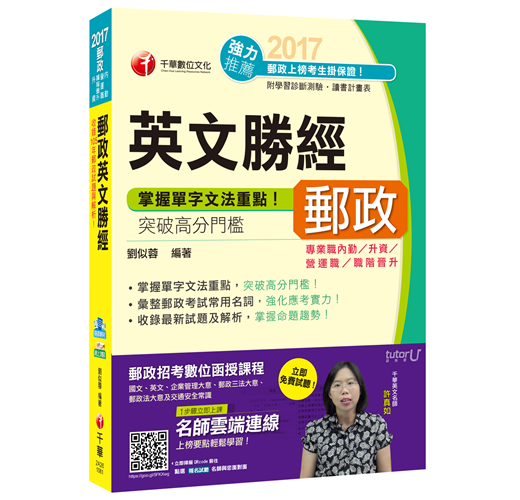為使考生在郵政考試中獲得高分,編者特別收集郵政相關的常用字彙、英文國名、地名譯寫原則、街道名稱英譯摘錄等,做一統整。也將其中所有曾考過的以及重要的單字、片語、文法、句型、會話、綜合測驗等重新編寫彙整,以方便考生閱讀,強化應考實力。