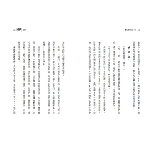 史考特的腳踏車!史考特回家了!史考特是喬治的哥哥,今年剛進高中。喬治感覺頸背汗毛豎起,不久,樓梯傳來沉重的腳步聲。鎖著的浴室門把被猛力搖動,喬治的心臟彷彿也被史考特捏得死緊。