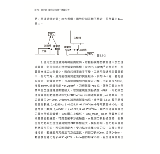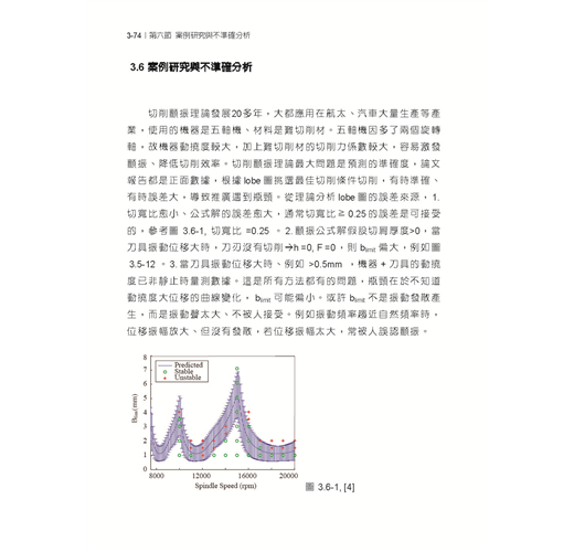 第三章:切削顫振理論應用:切削顫振理論,早在1990年已有許多學者投入研究,最早的顫振模型是車削,因為車削的切削力是固定,顫振方程式比較單純。後來則發展到銑削、五軸銑削。切削顫振理論,主要應用於航太難切削材與汽車業大量生產的工件,因為切削顫振是提高切削效率的關鍵。關於顫振的方法,有改變主軸轉數、刀具幾何、切削路徑工法等等,本章皆有詳細解說。